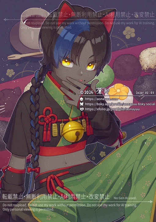 和風のキャラなので食べ物は和菓子で、三毛くんがお団子だったのでお餅系で何かと考えて、最終的にはおはぎになりました。