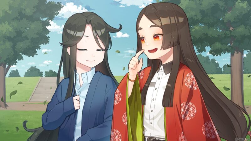 葉が落ち始めた季節に、芝生のある場所で弥樹 所縁さんと鴨 藻塩さんが出会い、穏やかに笑いあっている場面です。ゆっくりと時間が流れているような、穏やかで温かい雰囲気が表現できていればと思います。